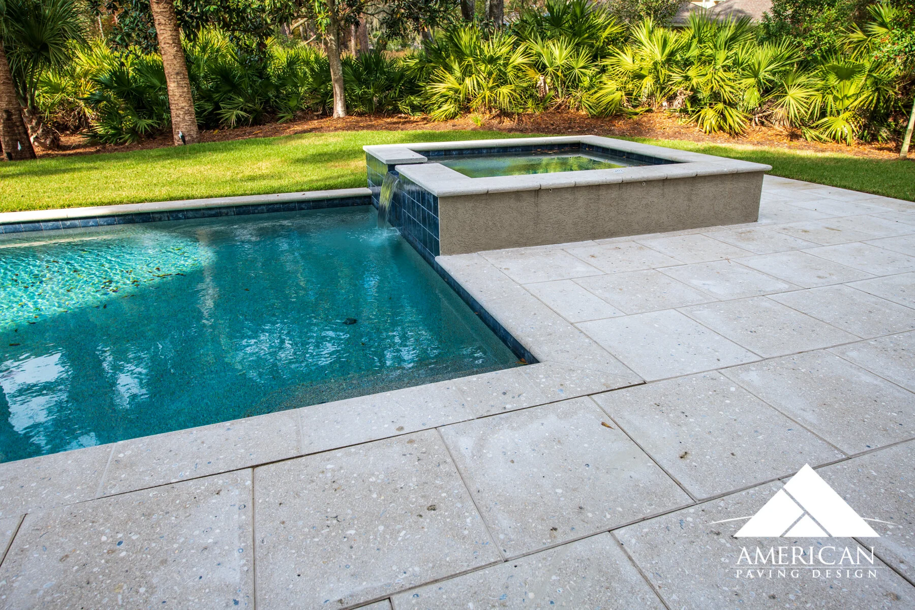 Natural stone pavers around pool.